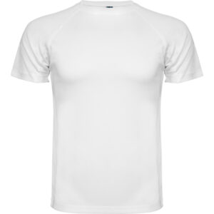 Camiseta de manga corta y cuello redondo para niño, con banda elástica en cuello de elastano de 1,5 cm con pespunte superior en la parte delantera, estructura tubular.